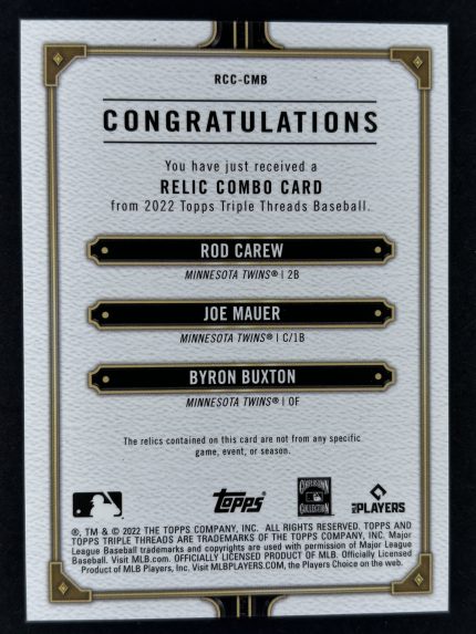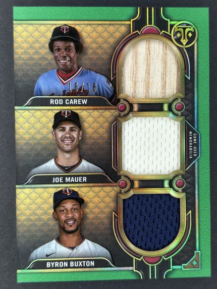 2022 Topps Triple Thread Rod Carew, Joe Mauer and Byron Buxton Triple Relic 16/18