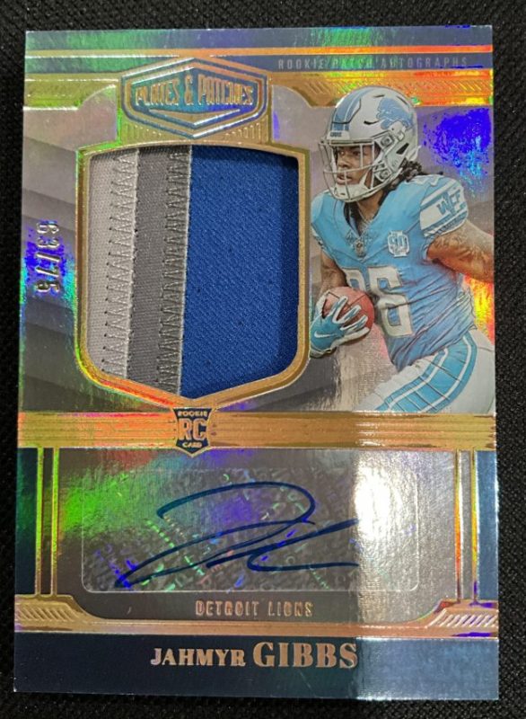 2023 Panini Plates and Patches Jahmyr Gibbs relic/ auto RC 63/75